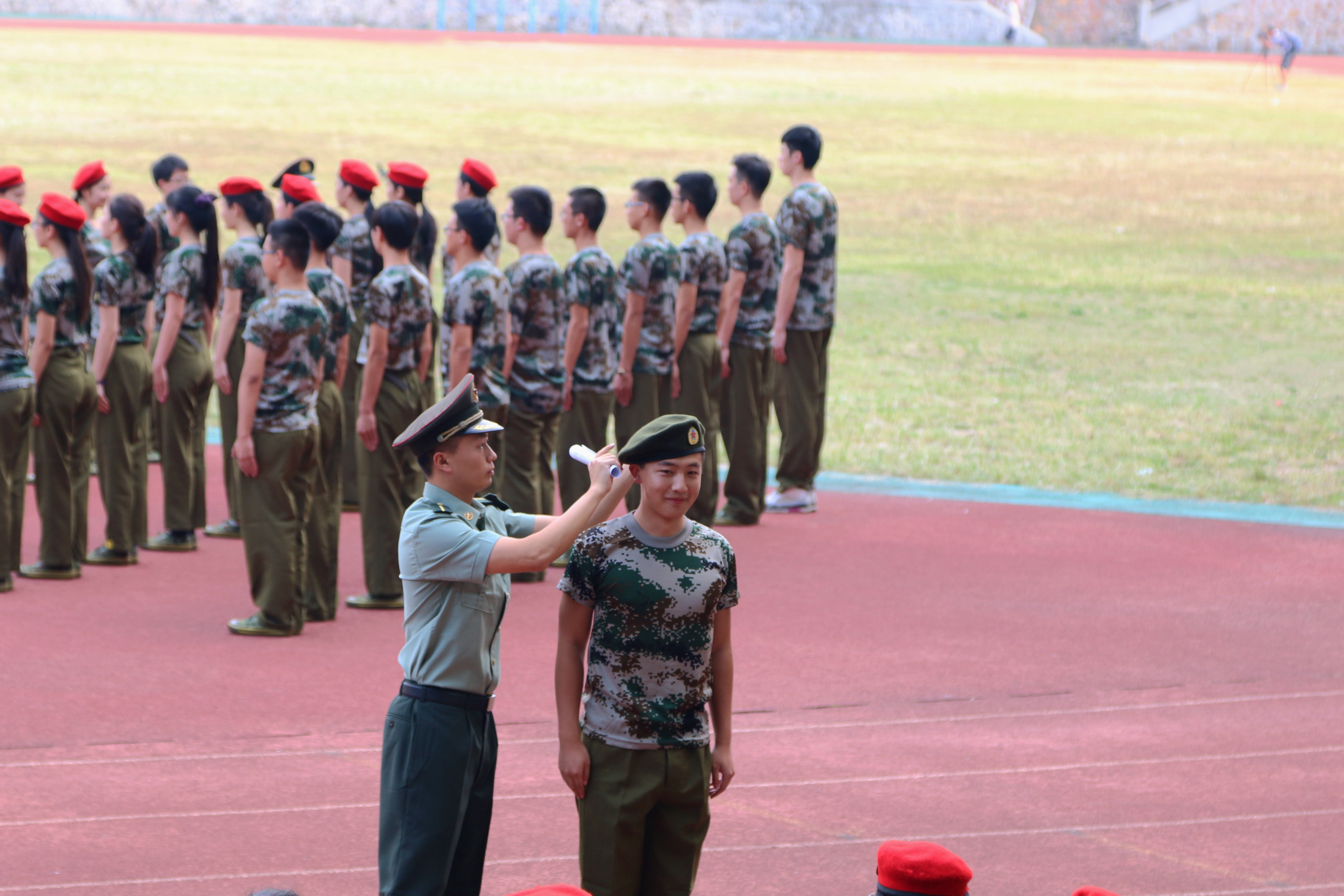 这一边的教官从队伍中拉出一名男生,给大家讲解贝雷帽的戴法,不得不说,整理好帽子之后确实更显精神。