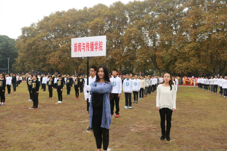 在由各个院系组成的方阵依次走过主席台后,身着白色上衣在奥场的草地上进行广播操表演赛的新闻院学生形成了一道亮丽的风景线。