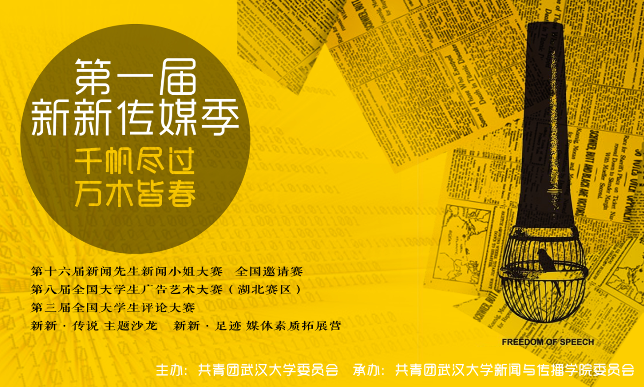 以“千帆尽过·万木皆春”为主题,第一届新新传媒季由五大赛事——第十六届新闻先生新闻小姐大赛全国邀请赛、第八届全国大学生广告艺术大赛(湖北赛区)、第三届全国大学生评论大赛、新新传说·主题沙龙和新新·足迹媒体素质拓展营共同组成。