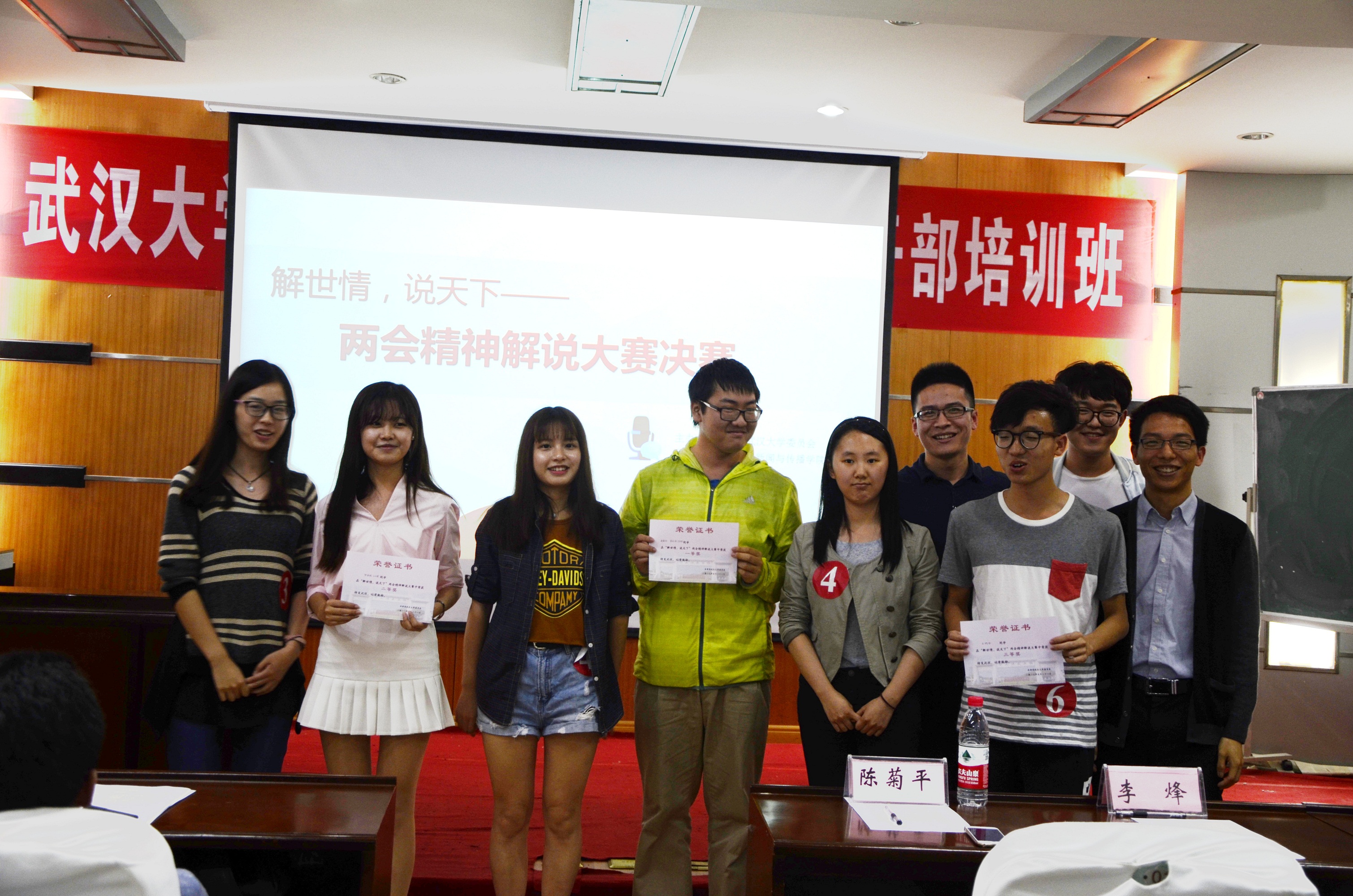 最终,14网传汪队、新闻青年队、这波不亏队得分较高,分别摘获一、二、三等奖。三位评委为获奖团队颁奖,送上祝贺并合影留念。通过本次大赛,选手们将对两会精神的探寻落脚于各个领域、各个题材,寻找不同视频之中的核心价值,将其与社会主义核心价值观和两会精神相贴合,寻找共鸣点,增强了当代大学生们联系实际,关心社会问题的意识,增强了同学们的社会责任感。
