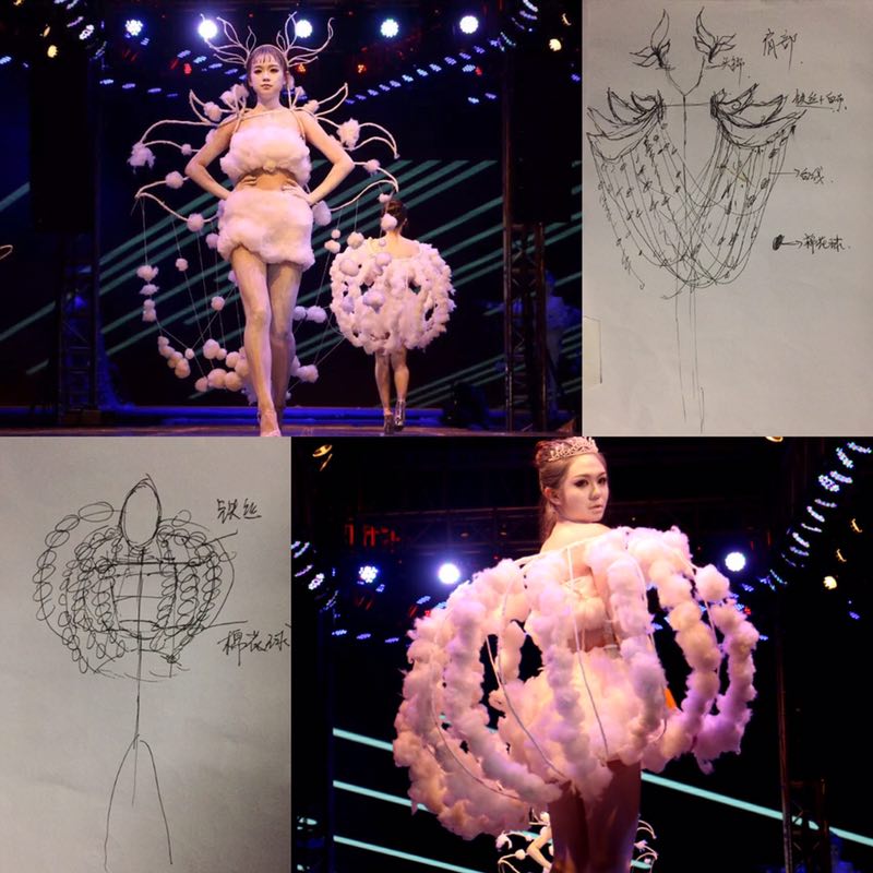 回忆起新闻院以往辉煌的金秋服饰赛,很多人都会想起光耀的流水、绮丽的镜子。今年主创人员却出乎意料地采用了最单纯不过的棉花做素材。