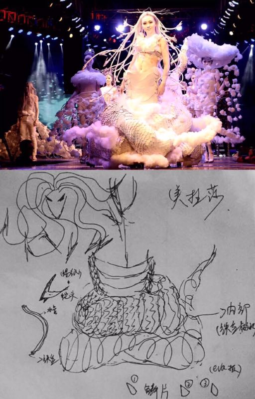 在制作基本完成之后,模特李聪颖来试衣服。发现“美杜莎”做得太小了,就又根据她边做边改,加高加大,之后又改尾巴。“美杜莎”的工时是最长的,前后一共耗费了十二天。