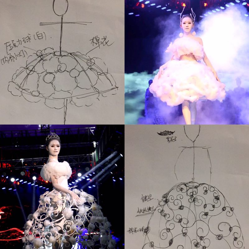 9月25号,迎新晚会结束不久后主席杨绍湫就开始考虑今年的金秋服饰。当提及素材的选择时,他笑着说:“说出来你可能不信,今年不是流行《阴阳师》吗?我那天抽到了阎魔,一个角色名,她坐在一片云上,我觉得这样的云特别好看。我就说什么样的东西能做成云的样子呢?那就是棉花了。所以最终就定的是棉花。”