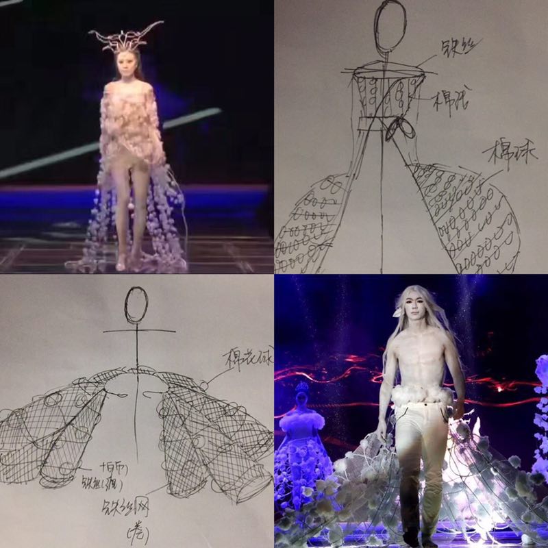 不仅是“美杜莎”,还有模特邓港月身后披的裙摆。制作人员把铁丝网剪成一个个三角形,再把三角形卷起来,接着把前面整个铁丝网都封住,做成一个又一个上面尖下面大的铁丝卷。之后他们再把十四个这样的铁丝卷拼在一起做成了一个裙摆。这件衣服同样十分耗费工时,模特邓港月自身也参与了它的制作。“制作大裙摆的铁丝网时,把平的网卷成卷,就会刮伤手,基本上每一个接触这个东西的人都被刺伤了。”刘若穹说,但即便如此,他们依然选择坚守在院办。