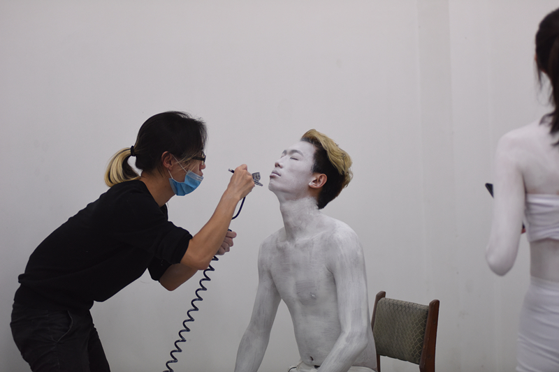 因为要打造全白的“石膏像”一般的效果,模特们在服饰赛当天都喷上了人体彩绘,晚饭也只能吃面包。“我是第一个吃螃蟹的人,就是第一个喷彩绘的人。”模特2016级本科生李艺佳笑着说。