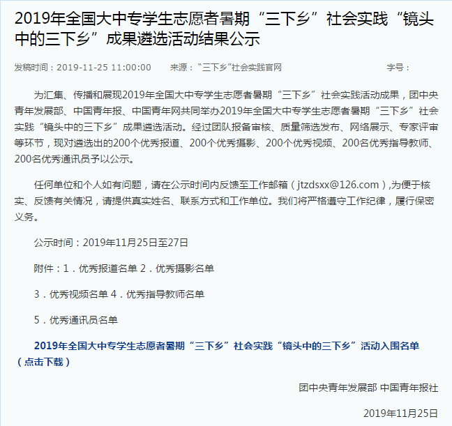 近日,在团中央青年发展部、中国青年报、中国青年网共同举办2019年全国大中专学生志愿者暑期“三下乡”社会实践“镜头中的三下乡”成果遴选活动中,海角视频
