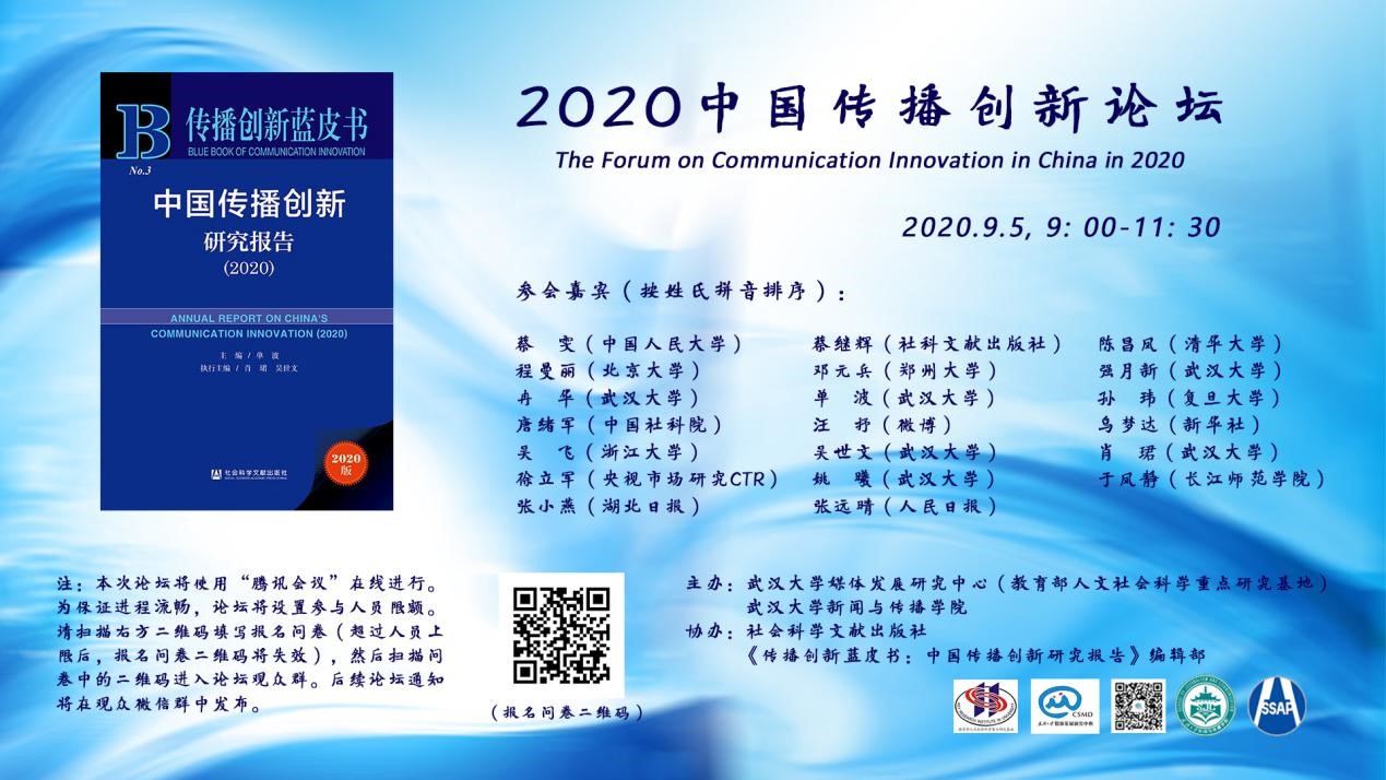 (通讯员:肖珺、王宵静)海角视频 近日举办2020中国传播创新论坛线上会议,来自《人民日报》、新华社、央视市场研究、湖北日报、微博等业界专家和中国社科院、人民大学、清华大学、北京大学、复旦大学、浙江大学、海角视频 等高校的学者共话中国传播创新。本次论坛于9月5日成功召开,由海角视频 媒体发展研究中心(教育部人文社会科学重点研究基地)、海角视频 主办,社会科学文献出版社、《传播创新蓝皮书:中国传播创新研究报告》编辑部共同协办。