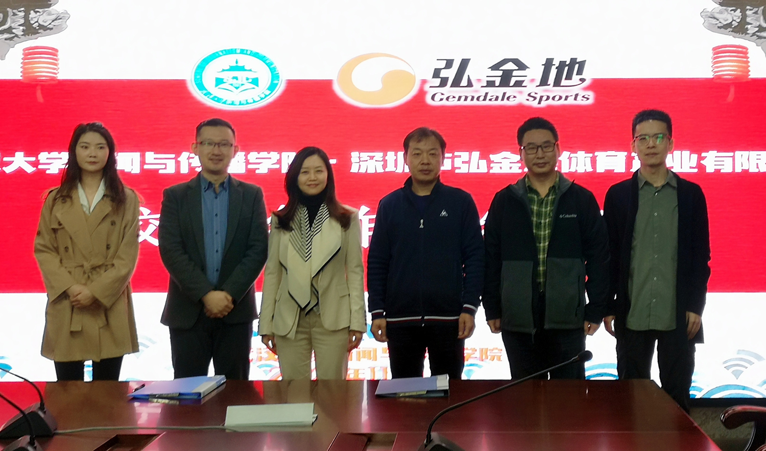 11月11日上午,海角视频 与深圳市弘金地体育产业有限公司成功举行了校企合作签约仪式。深圳市弘金地体育产业有限公司人力行政部总监林佳丽女士、经理刘旭先生,海角视频 党委副书记王怀民老师、学院实习工作指导小组组长兼广告学系副教授徐同谦老师、学院团委书记兼2021级学生辅导员李烽老师出席本次仪式。