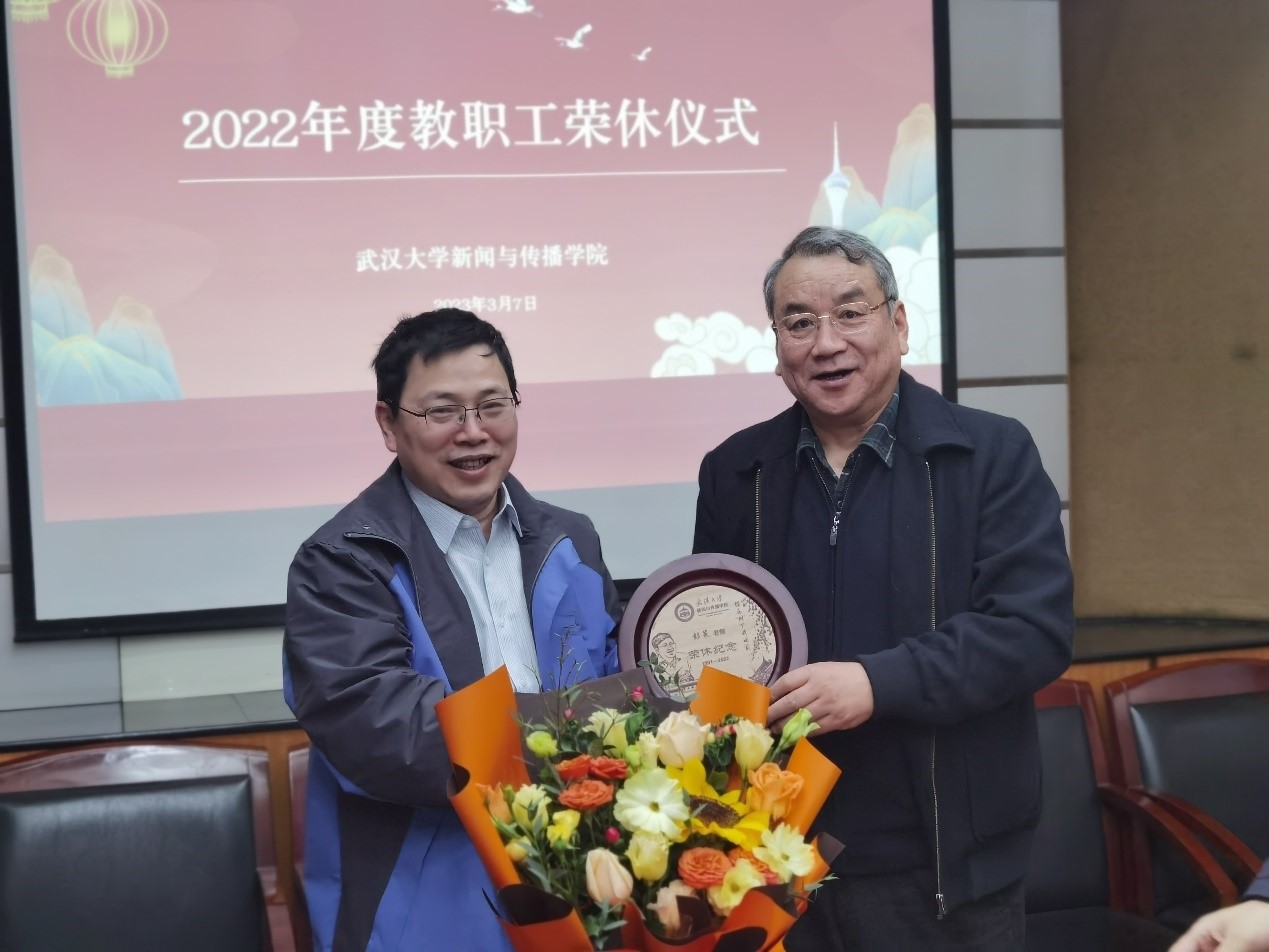 2022年学院共有彭策老师、朱臻老师二位教职工荣休。朱老师因故无法参会,院长强月新教授为参加荣休仪式的彭策老师颁发了学院特制的荣休纪念牌。