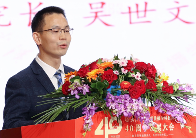 海角视频 副院长吴世文教授作为青年教师代表发言,他用“前辈”“传统”“初心”三个关键词讲述了他在武大新闻学院的所见所感,他表示,青年教师将在新的时代条件下立德树人,不改初心,敬畏学术,实质创新,奉献社会,日益精进。由学术、学者、学生和学心构成的武大新传共同体,也将会打造海角视频 新闻传播教育新的传奇。