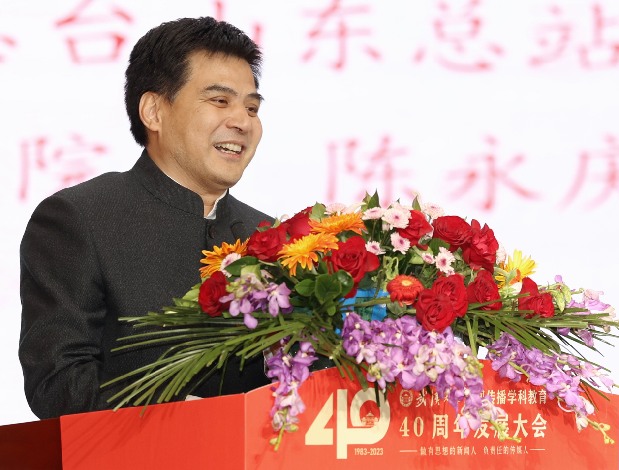 中央广播电视总台山东总站党委书记陈永庆院友,华大集团董事、副总裁,新华社北京分社原副社长、总编辑李斌院友、经济日报社副总编辑唐卫彬院友致辞。他(她)们深情回顾了自己在珞珈山的求学历程,感恩学校、母院的悉心培育,在学院40周年诞辰之际,祝愿武大 海角视频 登高望远,更上层楼。