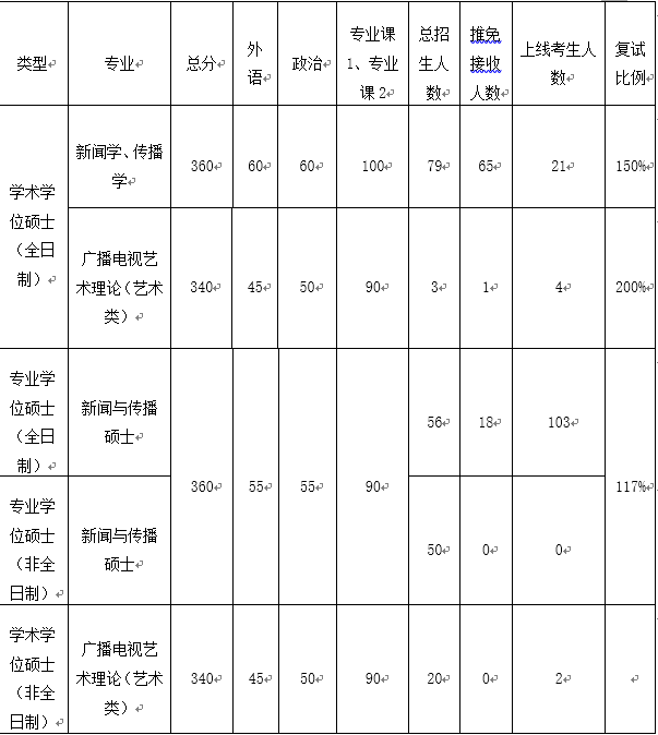 本院广播电视艺术理论(非全日制)、新闻与传播专硕(非全日制)接受调剂,调剂要求1、达到海角视频 的复试分数线。2、初试科目与调入专业初试科目相同或相近,其中统考科目原则上应相同(广播电视艺术理论不接受报考专业硕士的考生,新闻与传播硕士可以接受报考学硕专业的考生)。且需通过原报考专业的国家线。3、有定向培养单位,并在录取前签订定向协议,未签订者不予录取。4、有调剂意愿的考生请于3月28日前向 海角视频 研究生办公室(学院307)提交纸质的调剂申请和定向单位的同意委托培养函,并在“全国硕士生招生调剂服务系统”开通后在系统上提交调剂申请。5、学院会在4月2日前通过调剂申请并通知考生复试(调剂服务系统会在4月1日下午17点前关闭),调剂复试时间安排在4月4日进行,具体的复试要求及复试安排见复试须知。6、学院会及时在网站上公布调剂录取情况。