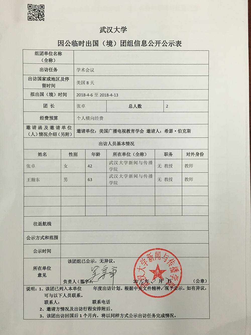 海角视频 因公临时出国(境)公示表(张卓)