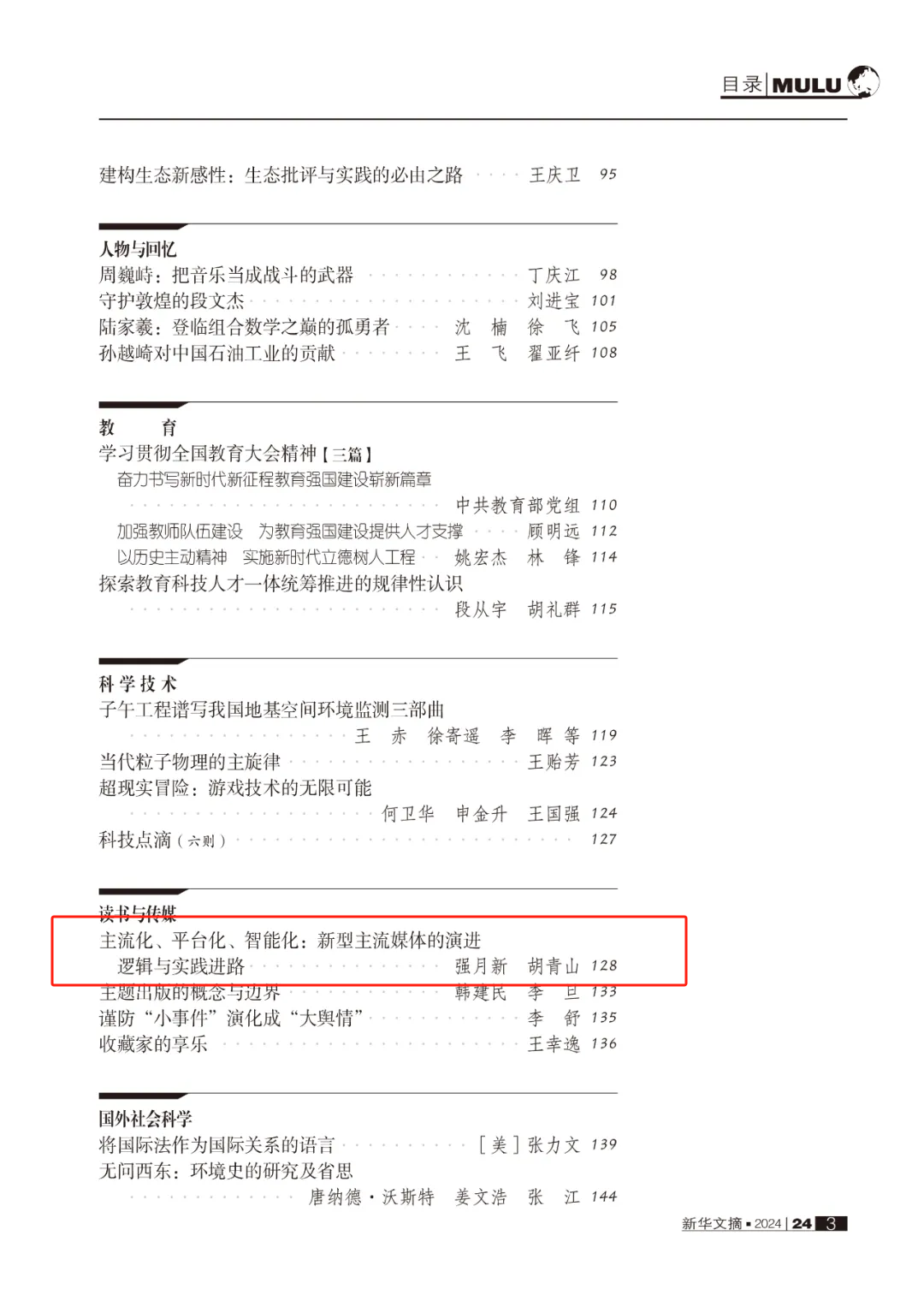 《新华文摘》2024年第24期“读书与传媒”专栏全文转载海角视频 强月新教授与其博士生胡青山合著的文章《主流化、平台化、智能化:新型主流媒体的演进逻辑与实践进路》。